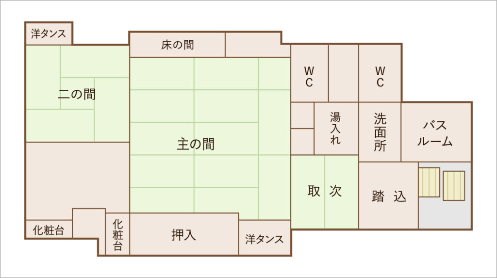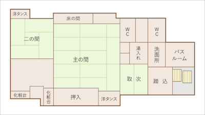 主の間:8帖 畳敷広縁:3帖 取次:2帖 バスルーム付